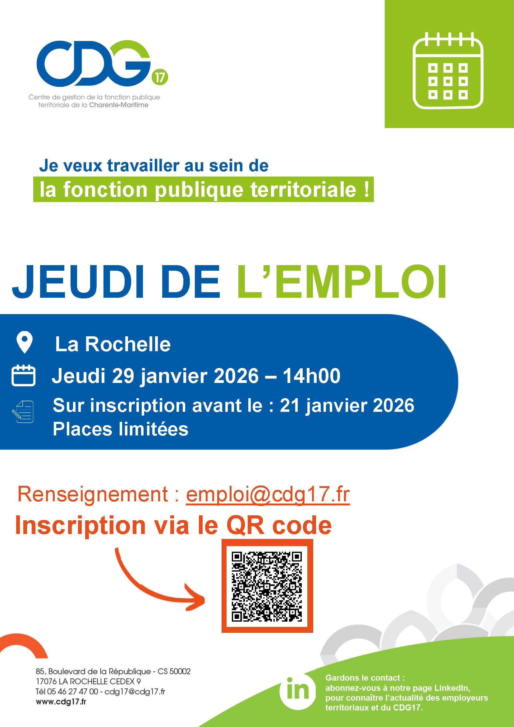 Afin de mieux faire connaitre les opportunités de recrutement et de carrière dans nos mairies, le service Emploi du CDG 17 organise les « Jeudis de l’emploi », sous la forme de réunions d’information à destination des demandeurs d’emploi intéressés par la fonction publique territoriale.